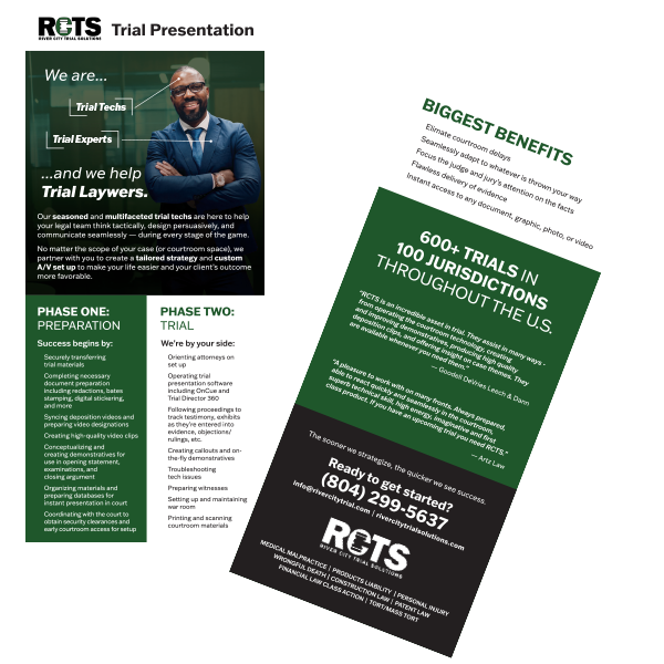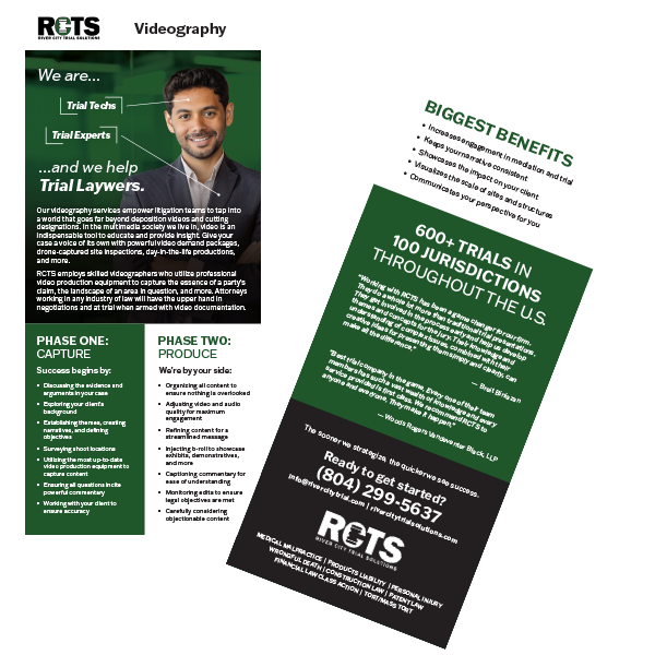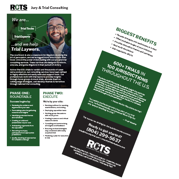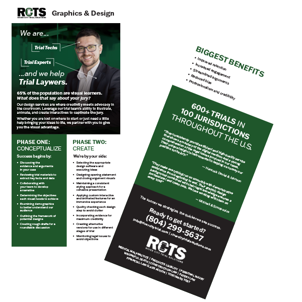 Learn More About Our Services Trial Presentation Rack Card Jury / Trial Consulting Rack Card Graphic Design / Animation Rack Card Videography Rack Card Print And Production Rack Card (coming soon)